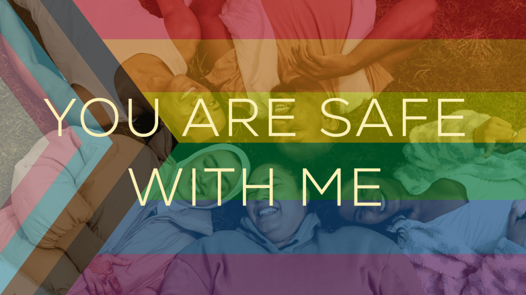 This page was inspired by a campaign at my workplace, using the “You Are Safe With Me” pins from the Gay Pride Shop